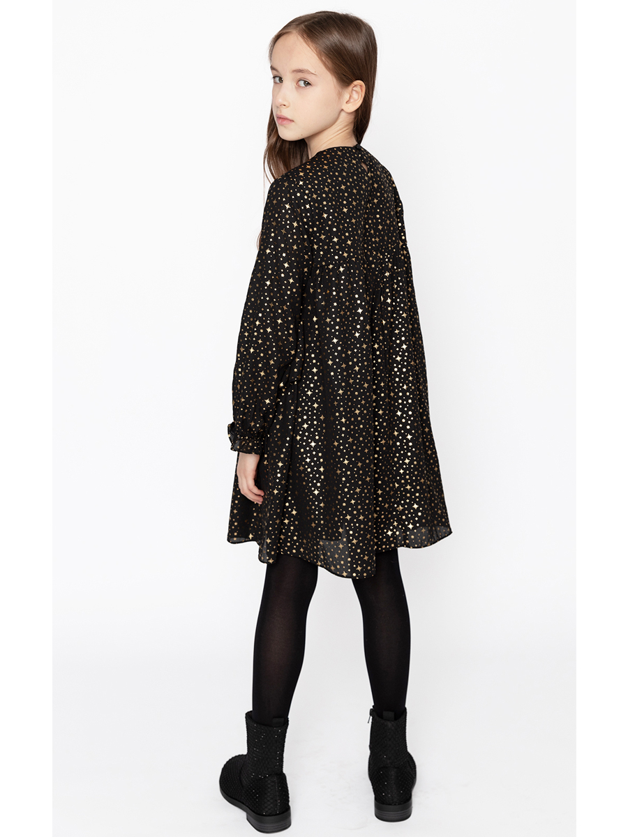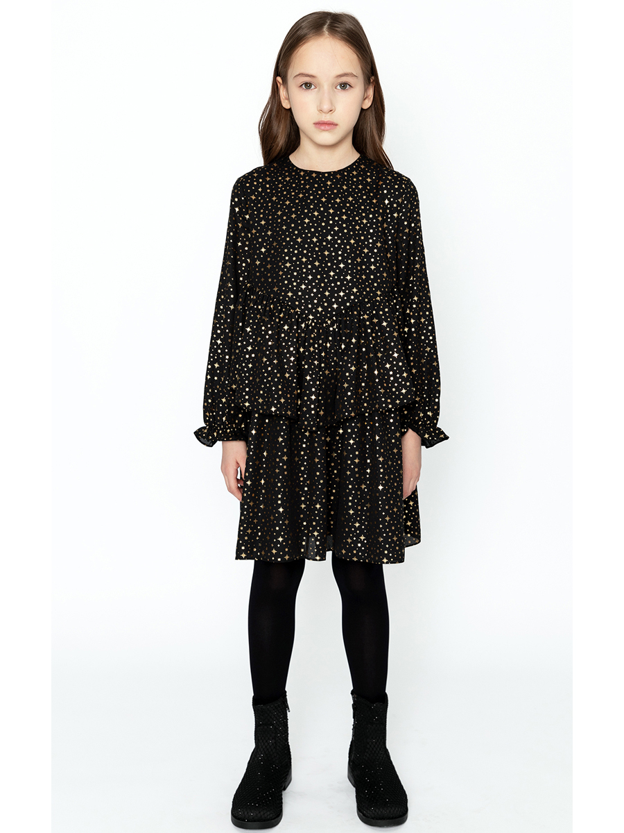 Altın rengi varak yıldız baskılı şifon rahat kalıp elbise %100 Polyester Astar %100 Pamuk