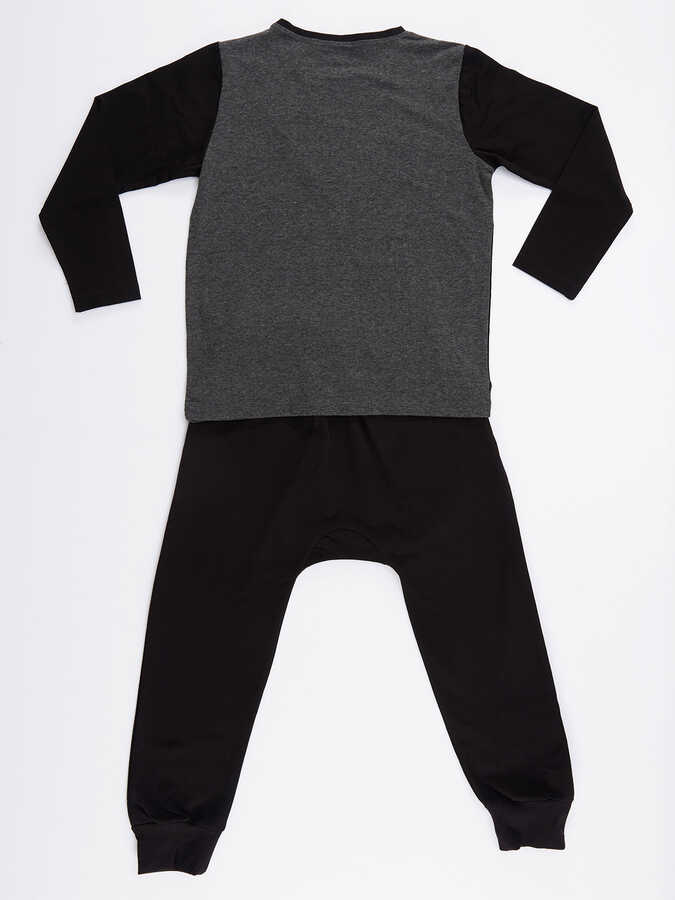 2 parça erkek çocuk pantolon ve t-shirt takım. Uzun kollu, pamuklu, üzeri büyük yıldız aplikeli t-shirt. Ve takımın tamamlayıcısı düşük ağ kesimli, harem tarzı, iki kat cep detaylı, pamuklu pantolon. Üst%65 pamuk %30 polyester %5, elastan Alt: %92 pamuk %8 elastan