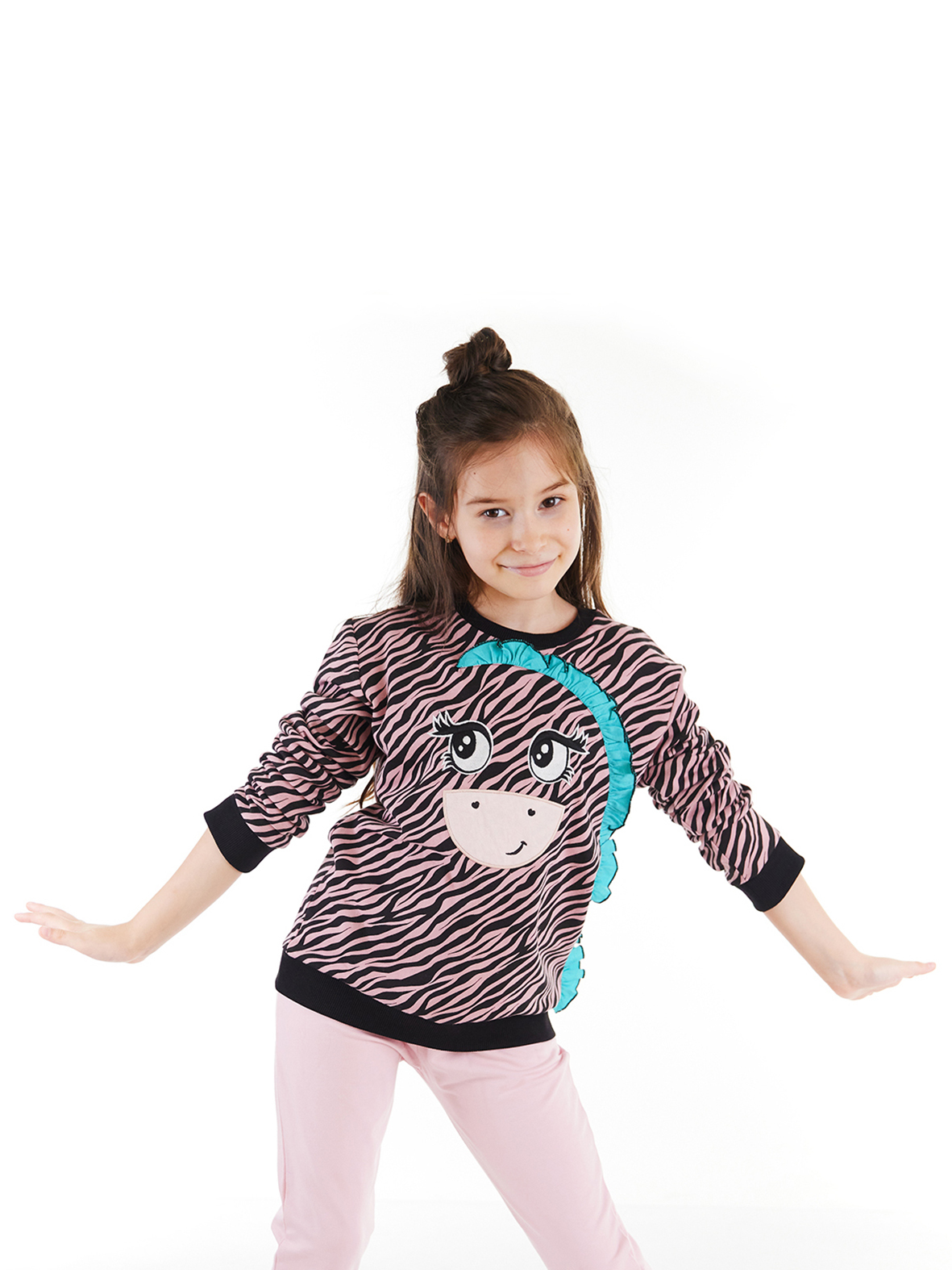 Orta kalın pamuklu kumaştan, ğzeri zebra aplikeli ve fırfırlı sweatshirt. %100 pamuk