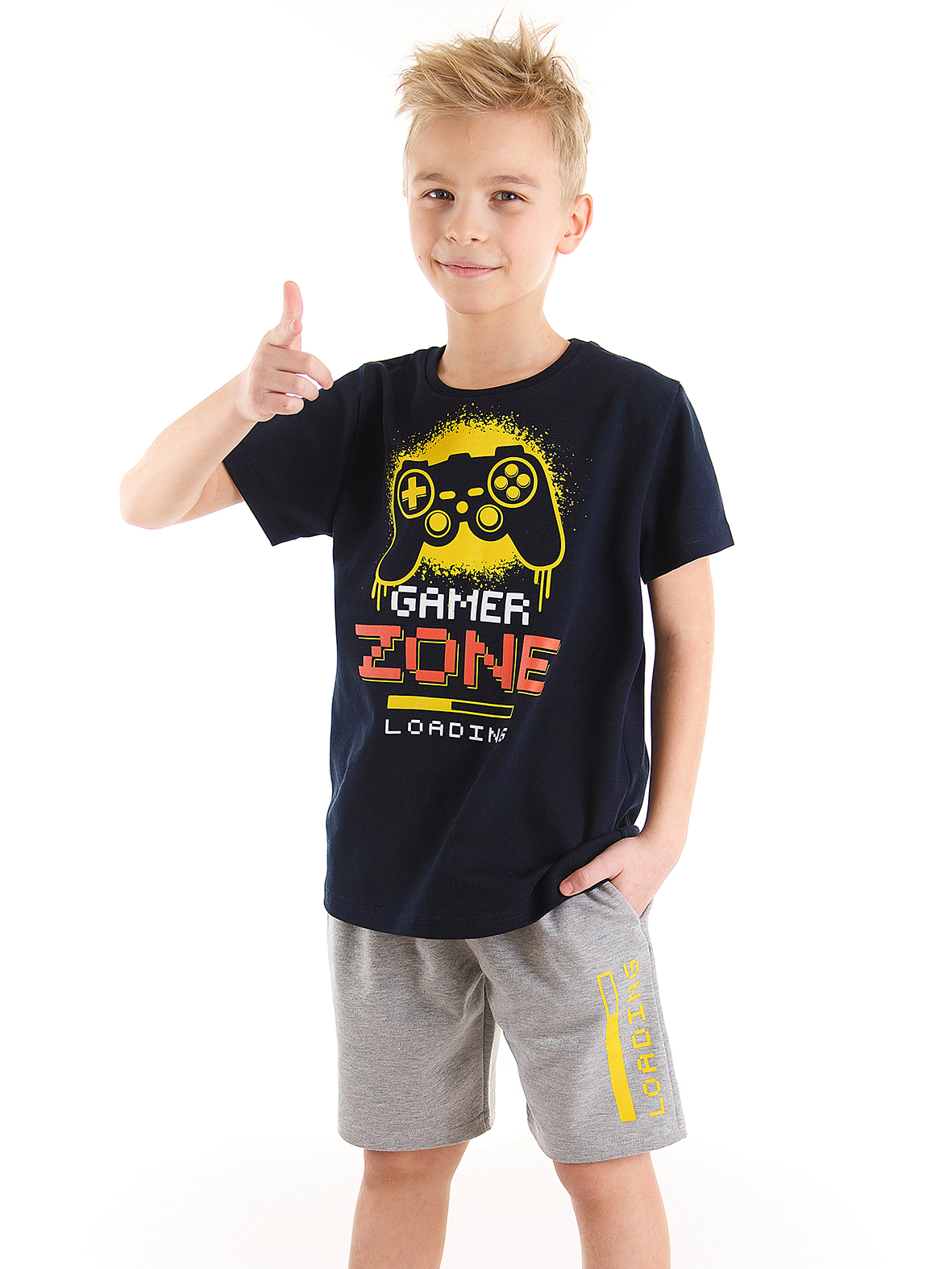 2 piece set. Cotton jersey t-shirt with a print on. And mid-thick cotton shorts with 2 side pockets and a print on single leg. Elastic bant on waist.
