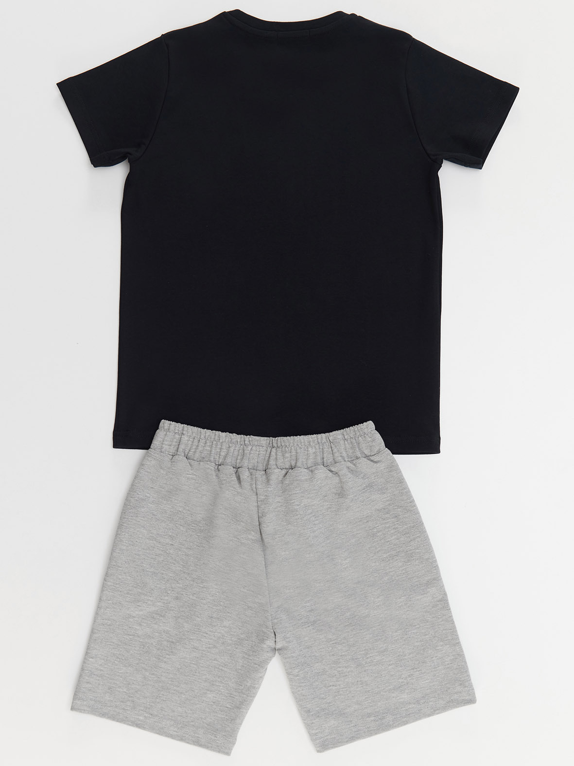 2 parça erkek çocuk takım. Pamuklu penye kumaştan, önü oyun konsolu baskılı t-shirt. Takımın tamamlayıcısı orta kalın, pamuklu kumaştan, 2 yan cepli şort. Şortun bir paçası baskı detaylıdır. Beli lastiklidir.